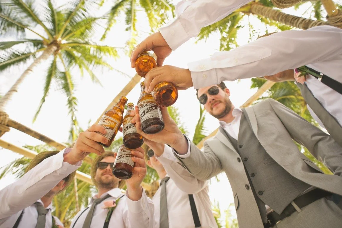 Group of people wearing formal attire raising beer bottles in a toast outdoors under palm trees.