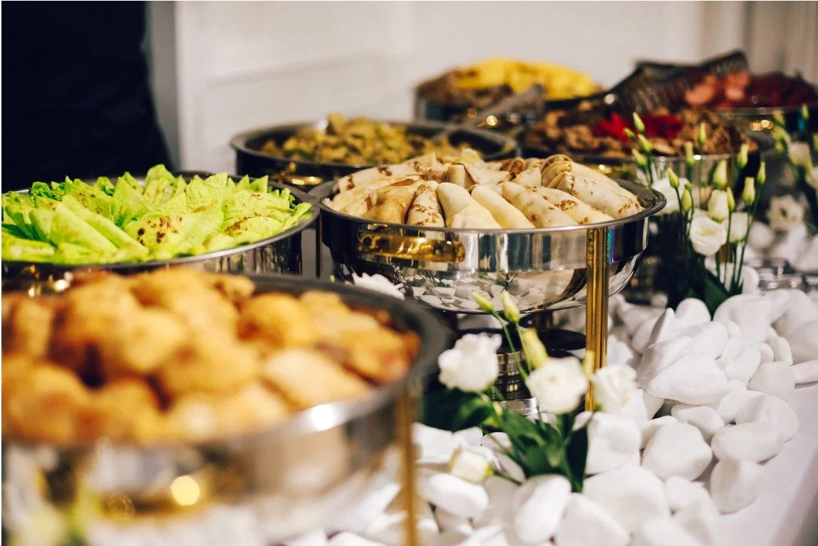 A buffet table with various dishes, including spring rolls, lettuce, grilled meats, and other foods, decorated with white flowers and shells.