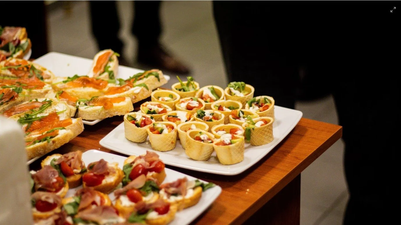 Assorted gourmet canapés and appetizers, including smoked salmon bites, topped with herbs and caviar, and other small savory finger foods.