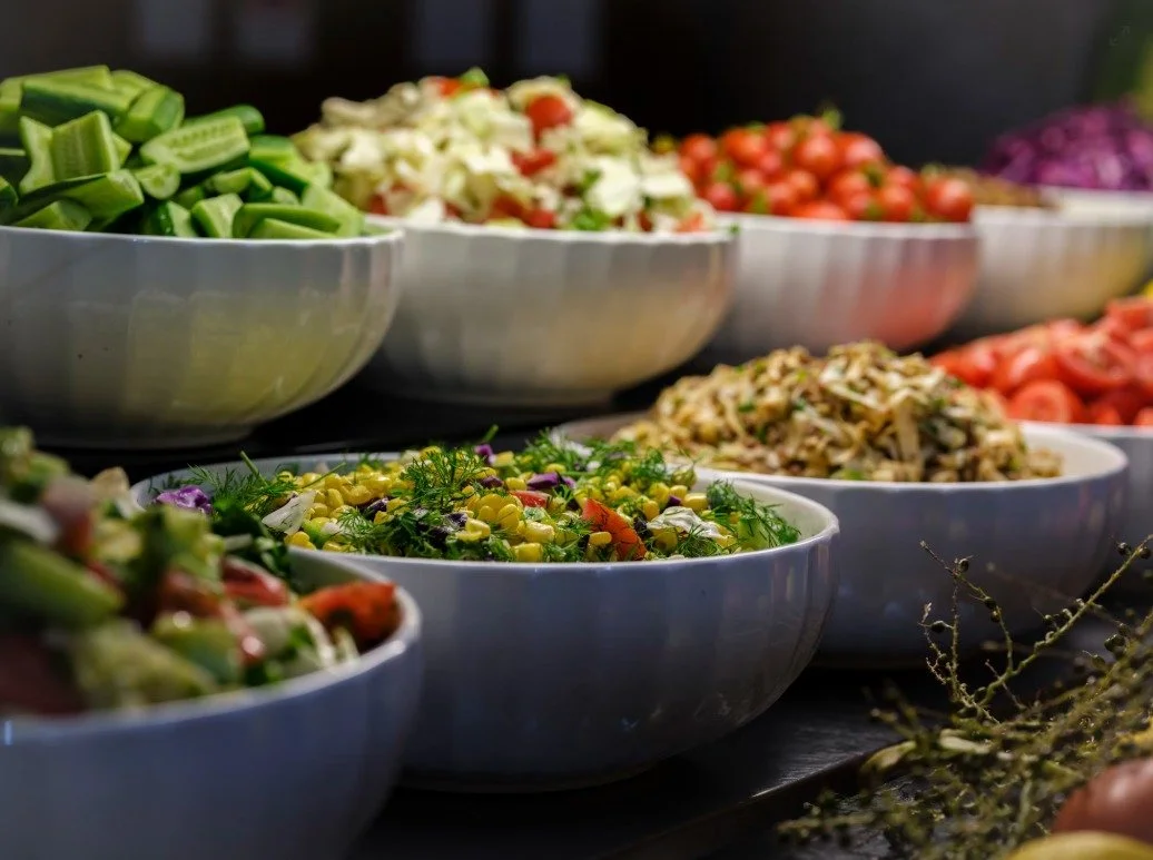 A row of white serving bowls filled with various colorful salads, including corn salad, tomato salad, and mixed vegetable salads, on a buffet table.